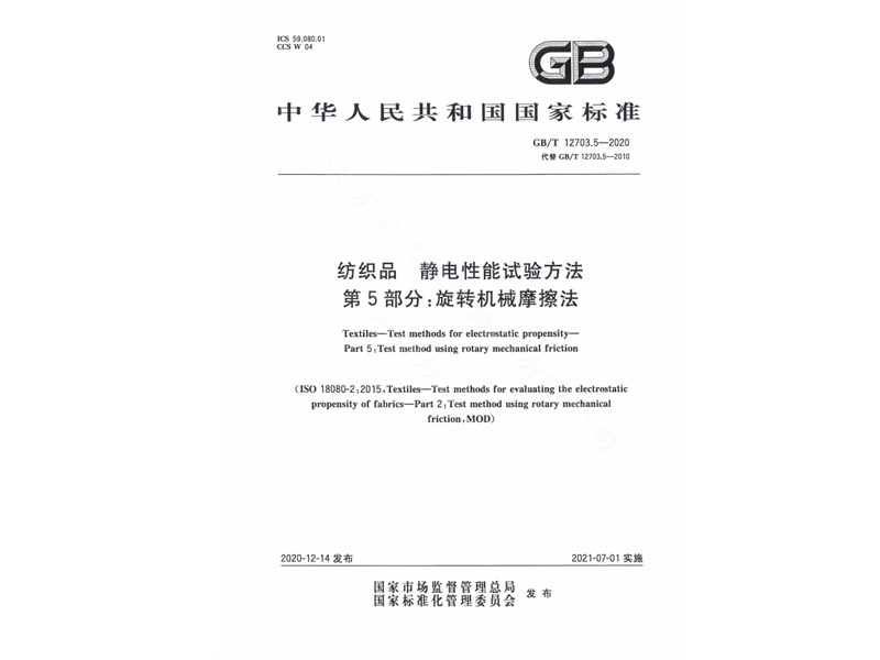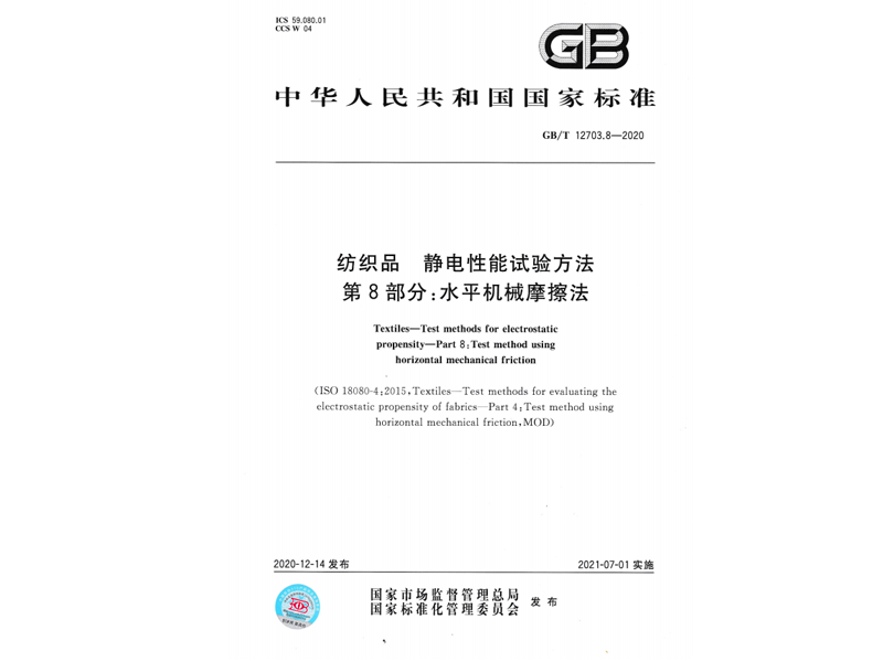 參與起草《紡織品 靜電性能試驗方法第8部分:水平機械摩擦法》(GB/T 12703.8-2020),該標(biāo)準(zhǔn)由國家市場監(jiān)督管理總局、國家標(biāo)準(zhǔn)化管理委員會于 2020-12-14 發(fā)布