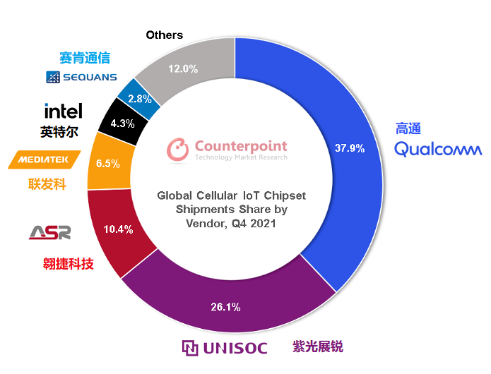 幾乎所有物聯網終端都需搭載IoT通信芯片,因而通信射頻芯片能夠直觀反映物聯網行業的成長周期與終端需求,堪稱行業風向標。在Counterpoint發布的全球蜂窩物聯網芯片追蹤報告中,高通、紫光展銳、翱捷科技、聯發科、英特爾、Sequans、華為海思等占據了大部分市場份額。