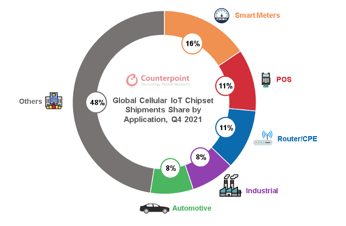 在蜂窩物聯網芯片中,當前應用規模最大的是低速率的NB-IoT芯片(占比60%),NB-IoT也是我國主推的物聯網連接方式,應用在智能儀器表盤、資產追蹤等場景。其次是中速率的2G/3G(占比30%),用于移動支付、智能穿戴和智能家居中。4G Cat.1和5G大約占比10%, 5G模組的成本過高,加上大部分物聯網終端對傳輸速率的需求性不高,5G在物聯網終端的應用占比較低,主要是自動駕駛和視頻監控領域,但隨著2G/3G轉網,Cat.1在智能支付、定位追蹤、車載終端、視頻監控領域的高速增長,正逐漸打破蜂窩物聯網6:3:1的格局。從應用場景來看,智能表計、POS支付、路由器/CPE、工業、汽車是蜂窩物聯網芯片應用最廣泛的前五大場景。
