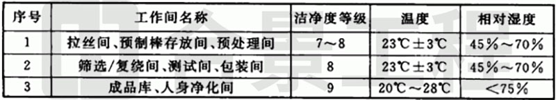 1 光纖廠房的潔凈度等級和溫度、相對濕度參數應符合表4.1.5的規定。